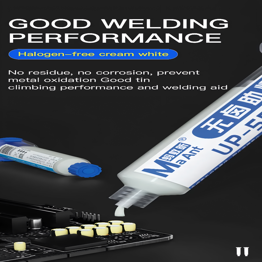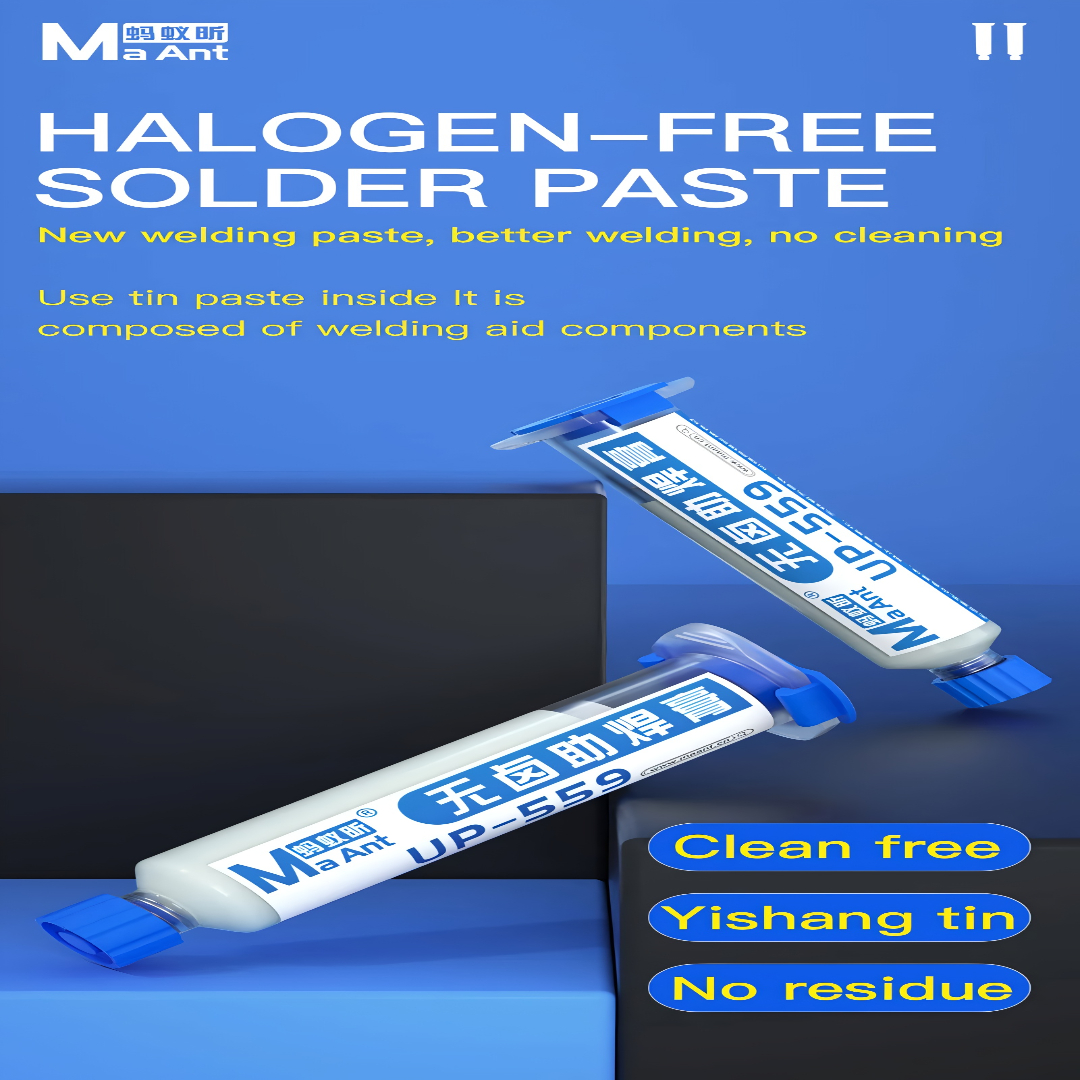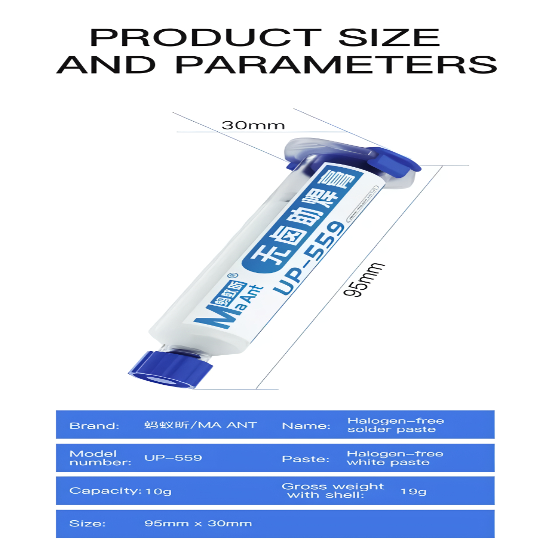 The MaAnt UP-559 10cc Halogen-Free Soldering Flux is a premium-grade flux paste designed for professional electronics repair and soldering. Its halogen-free, non-corrosive, and low-residue formula ensures safe and efficient soldering without damaging delicate components.