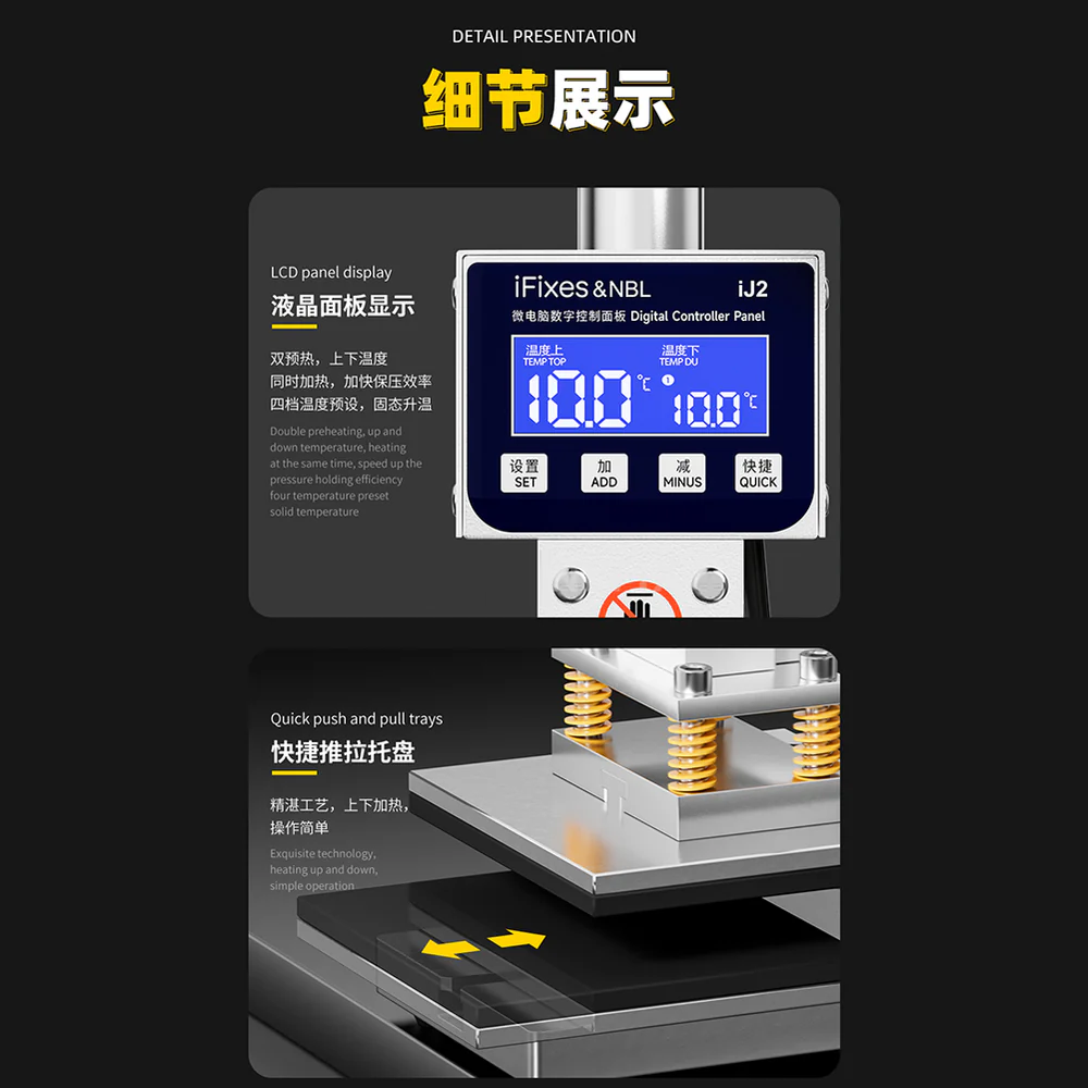 1. iFixes iJ2 multifunctional double preheating and holding pressure machine, used for air tightness restoration, back cover hot pressing, support screen frame hot pressing, whole machine hot pressing, upper and lower heating temperatures are adjustable.