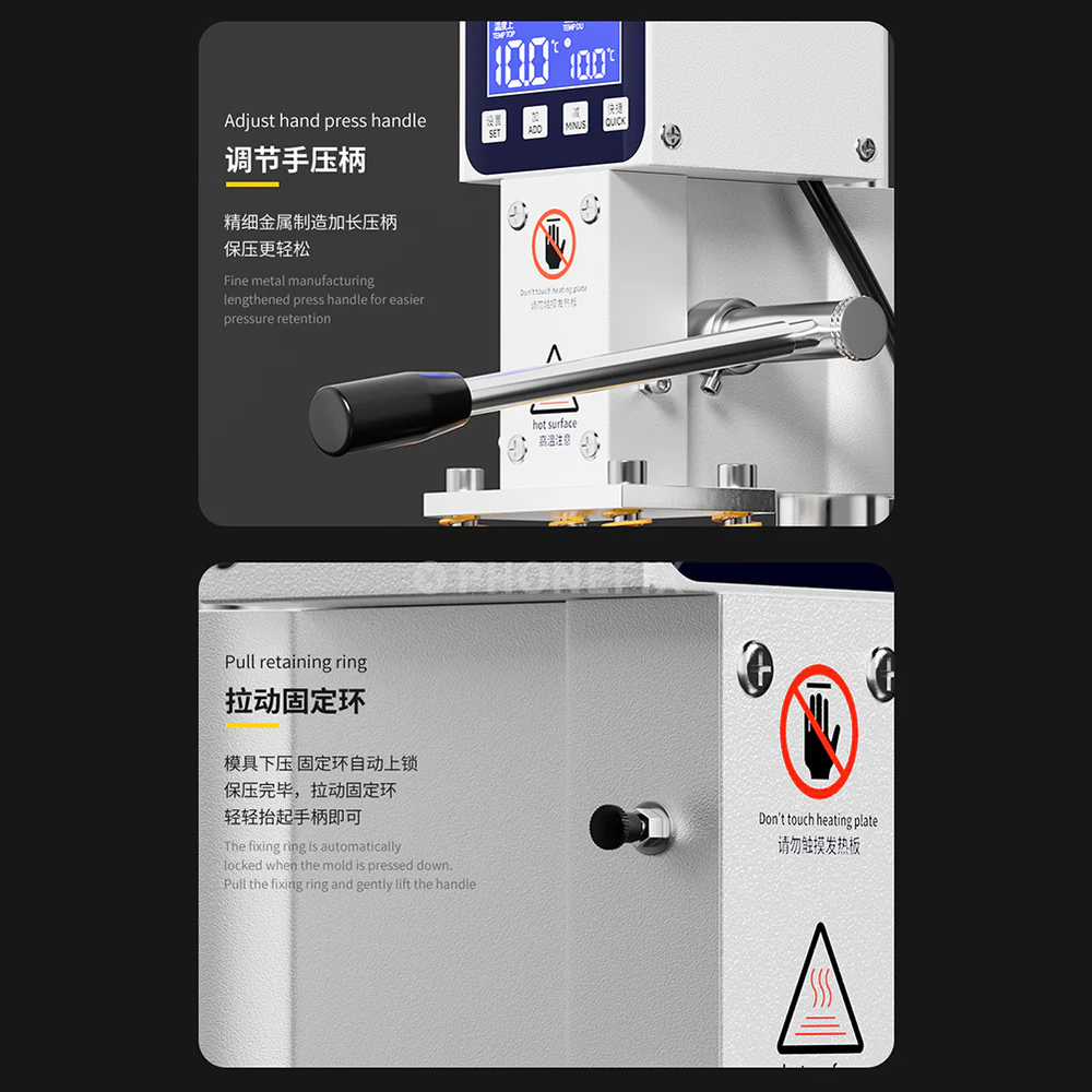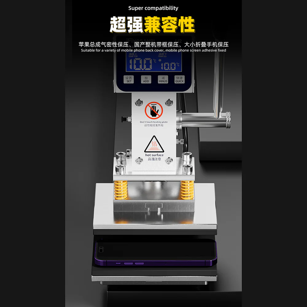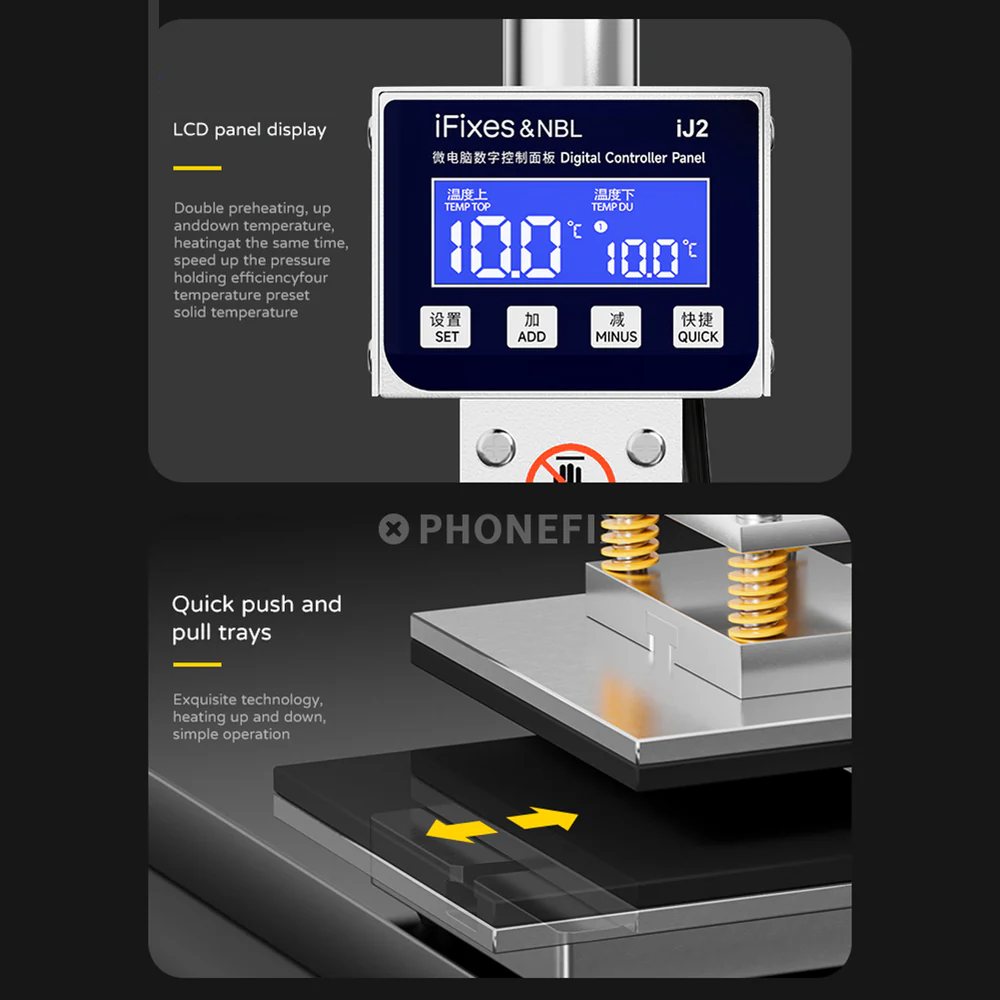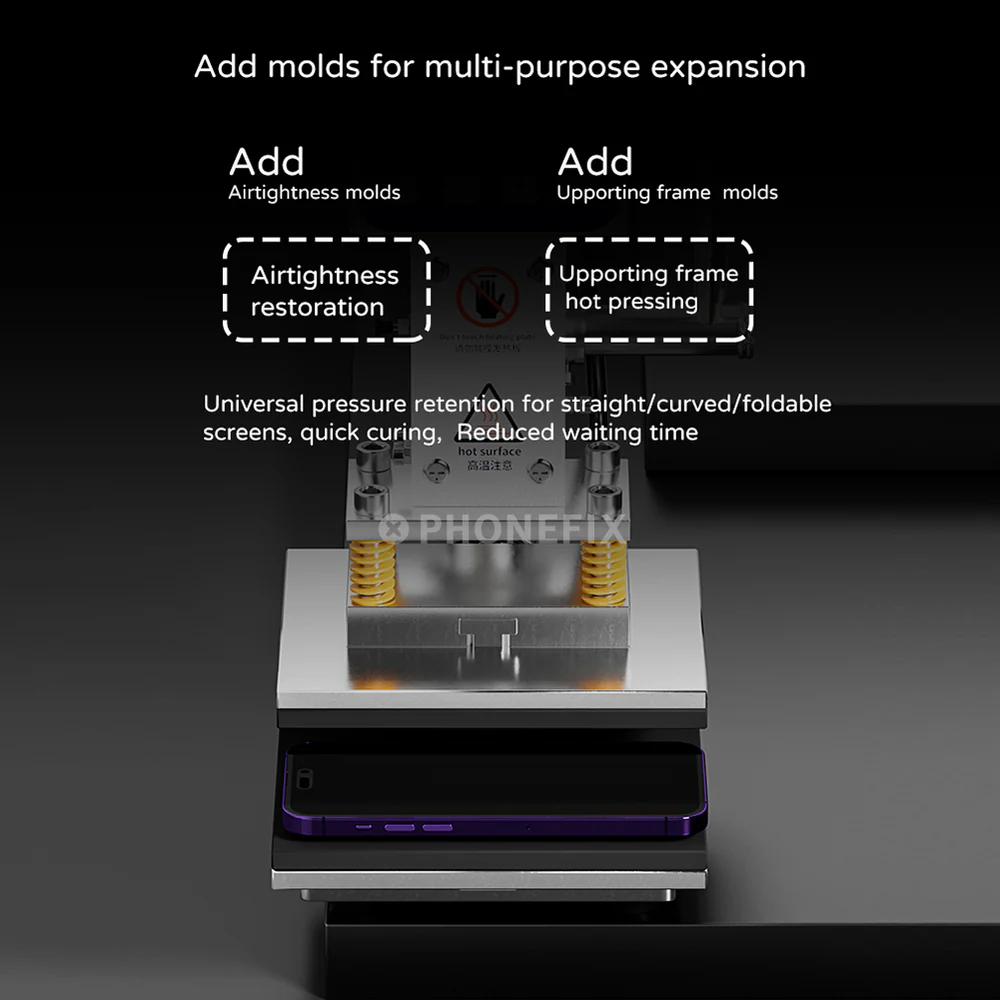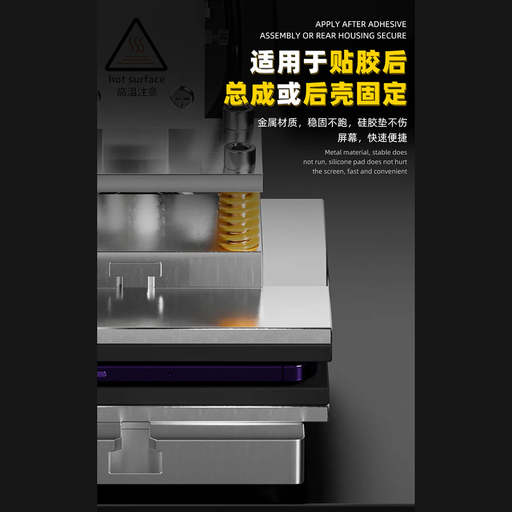 iFixes iJ2 Multi-purpose Dual Preheating Holding Pressure Machine for iPhone screen bracket frame hot pressing, mobile phone back cover pressing, airtightness restoration, and pressing of mobile phones, including straight/curved/folding screen mobile phones.