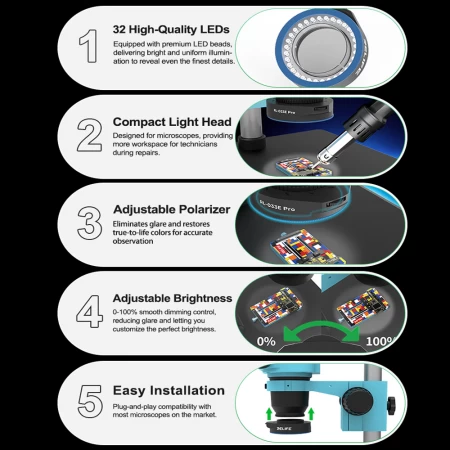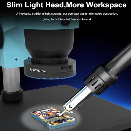 • Slim Light Head, More Workspace: Unlike bulky traditional light sources, our compact design eliminates obstruction, giving technicians full freedom to work