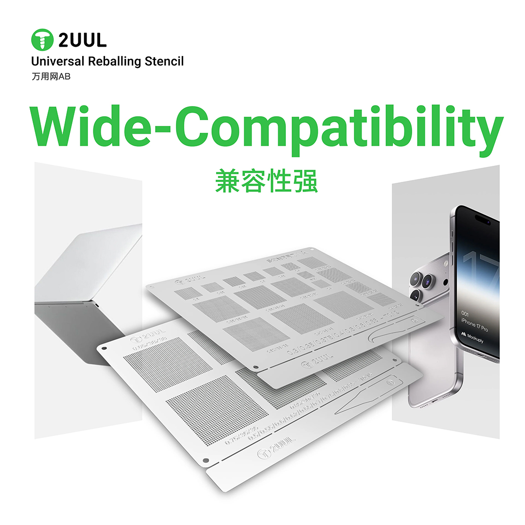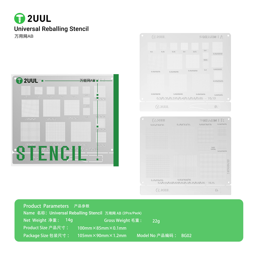 2UUL BG02 Universal Reballing Stencil AB with Various Pitch Sizes for Mobile Phone and iPhone X-17 Pro Max Chips Soldering and Repair. 2UUL AB Universal Reballing Stencil with 0.3 0.35 0.375 0.4 0.5 0.5 0.65 spacing and 0.5 0.55 0.6 0.62 0.7 0.75 0.8 0.85 pitch size for most mobile phone chips, such as iPhone CPU, Nand flash, WiFi IC, Baseband IC, Small IC, Power Management IC, etc.