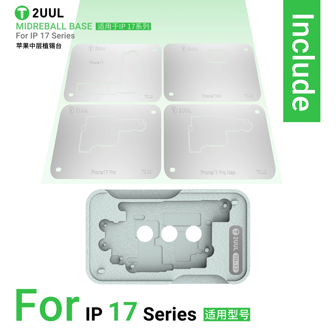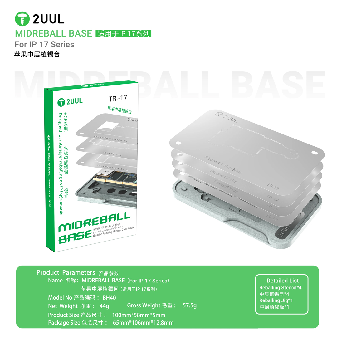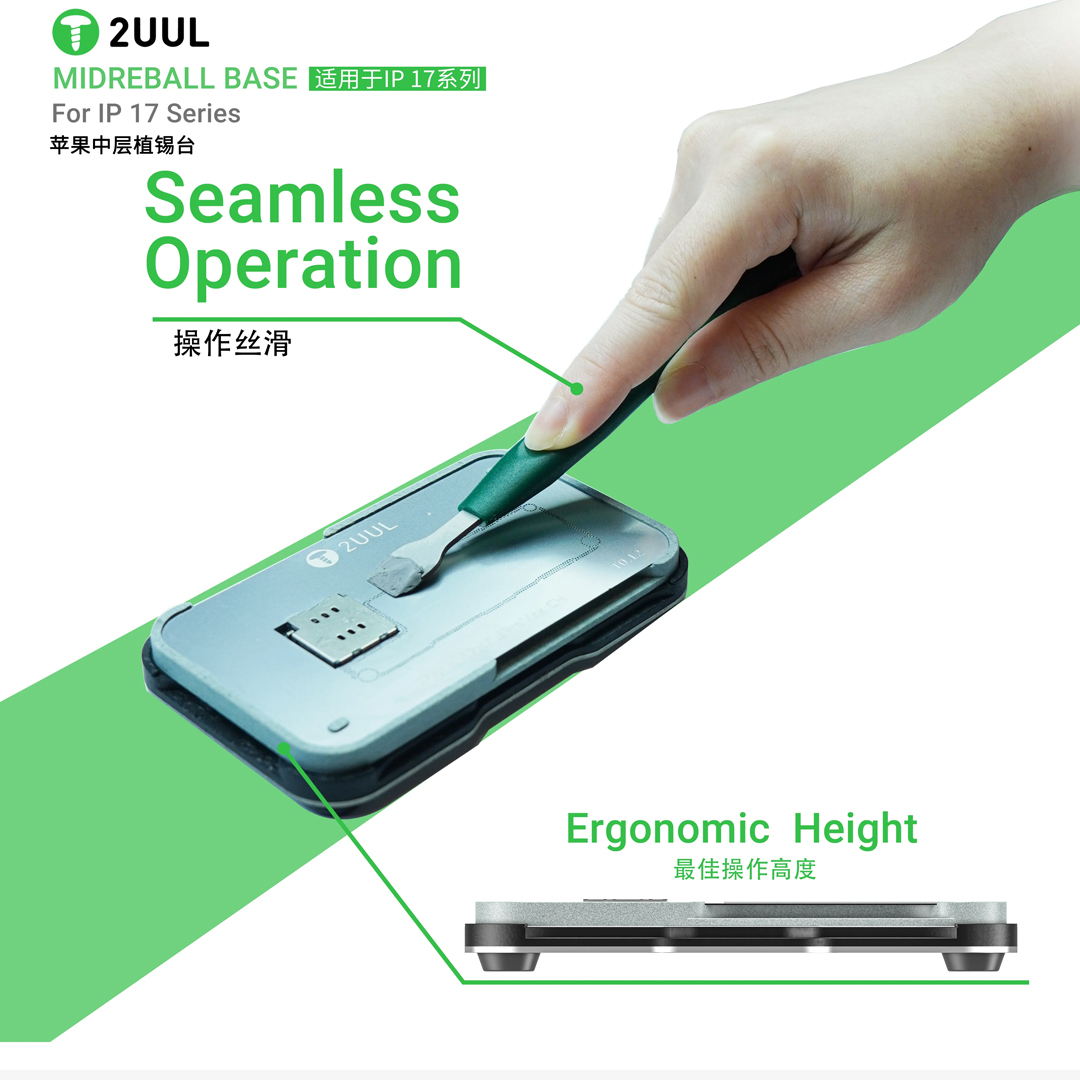 The 2UUL BH40 TR-17 Mid Reball Base Magnetic Platform Set is a professional reballing accessory engineered to improve precision and control during chip-level repairs. Featuring a strong magnetic base and stable metal platform, this tool securely holds ICS, CPUs and BGA components in place for reballing, soldering or alignment jobs, significantly reducing movement and errors.